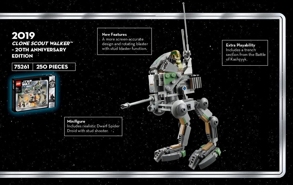 On this page you can find the original construction manual for the LEGO 75261 set. With the assembly manual you can easily learn how to build the 75261 Clone Scout Walker – 20th Anniversary Edition step by step. The set was released in 2019.