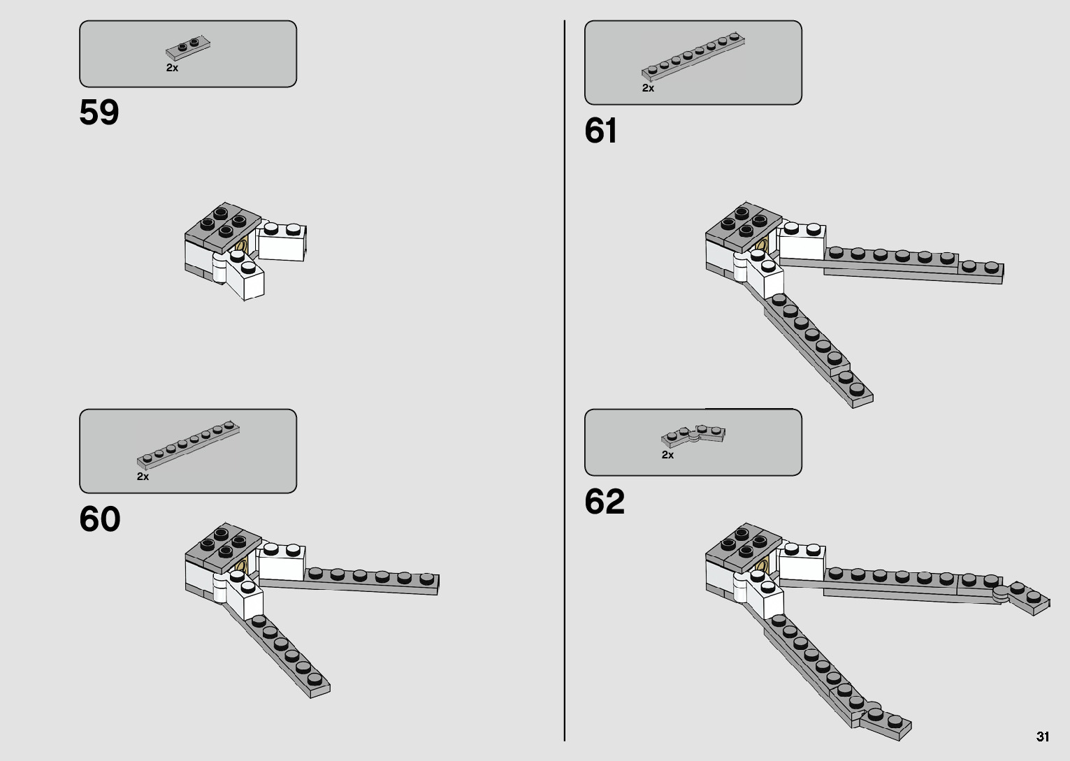 The assembly guide is prepared in a very understandable way for children and adult LEGO enthusiasts. A total of 124 picture galleries are shown, explaining the step-by-step construction stages for 1 different structures.