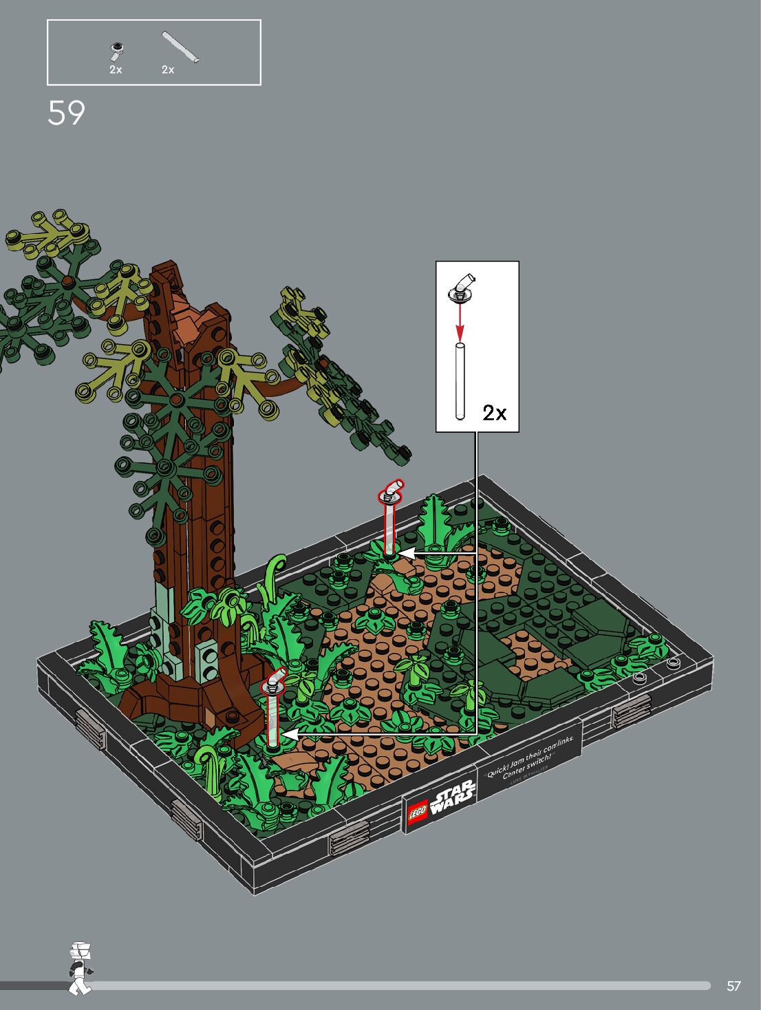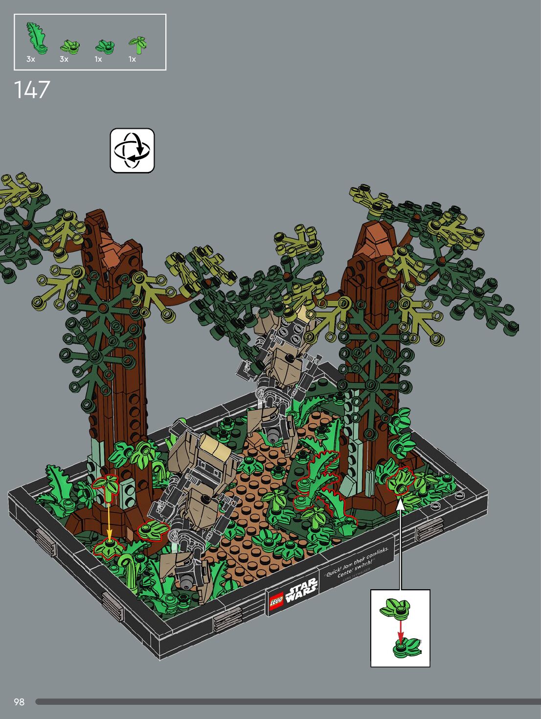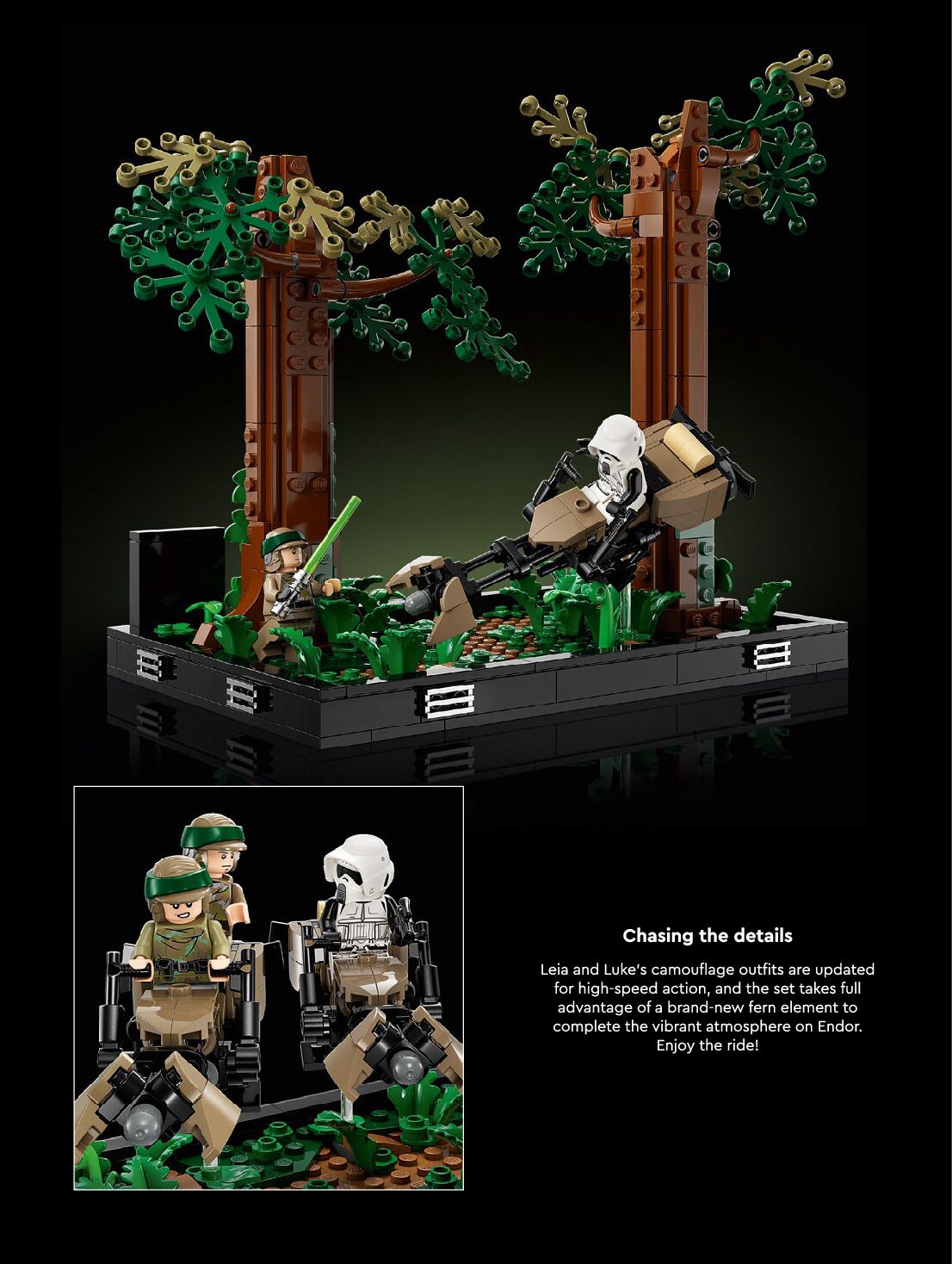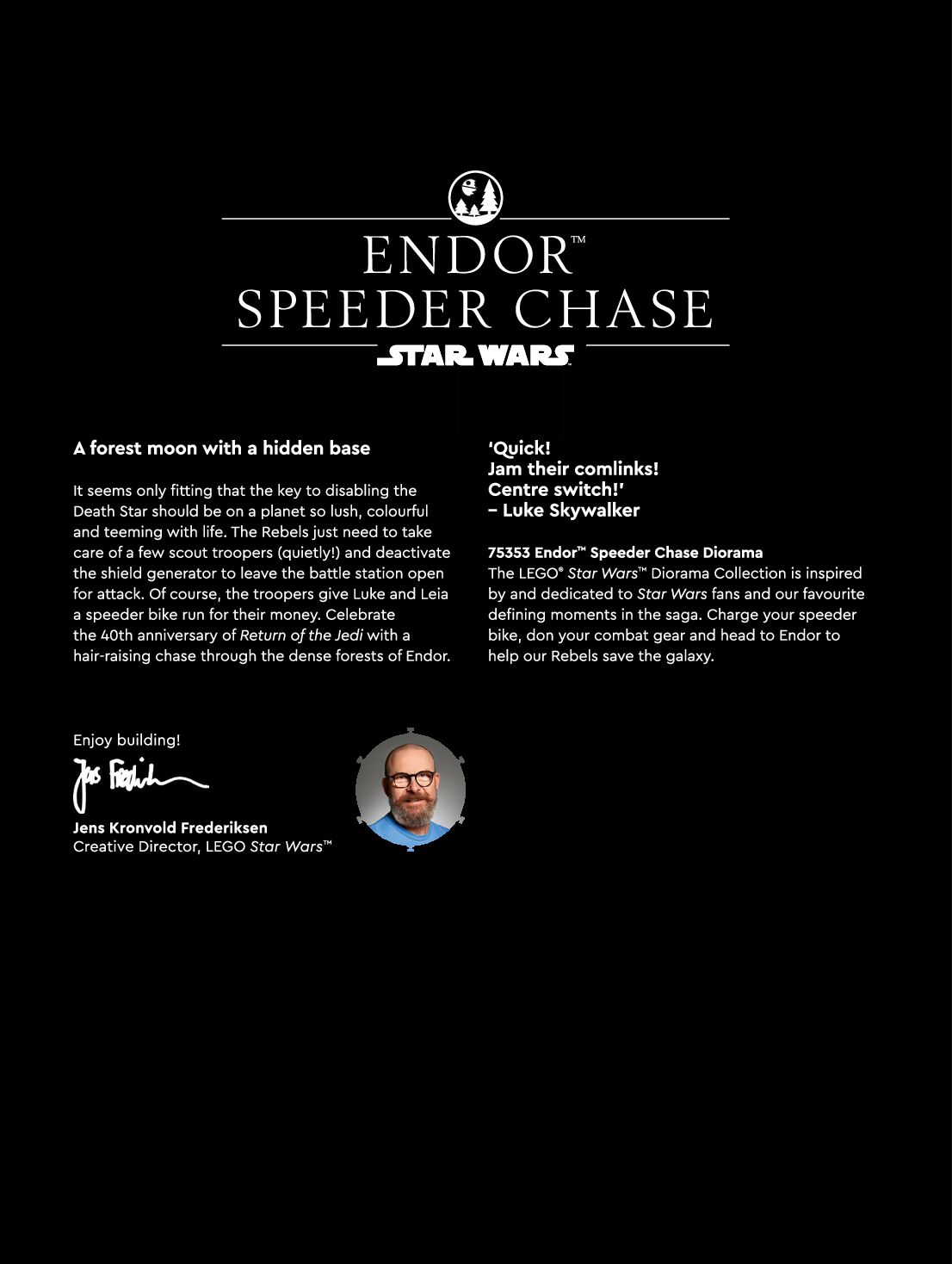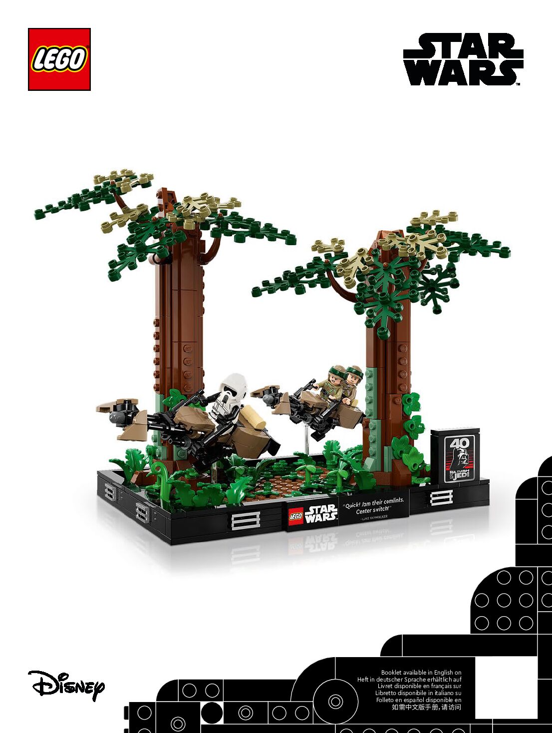 On this page you can find the original construction manual for the LEGO 75353 set. With the assembly manual you can easily learn how to build the 75353 Endor Speeder Chase Diorama step by step. The set was released in 2023.