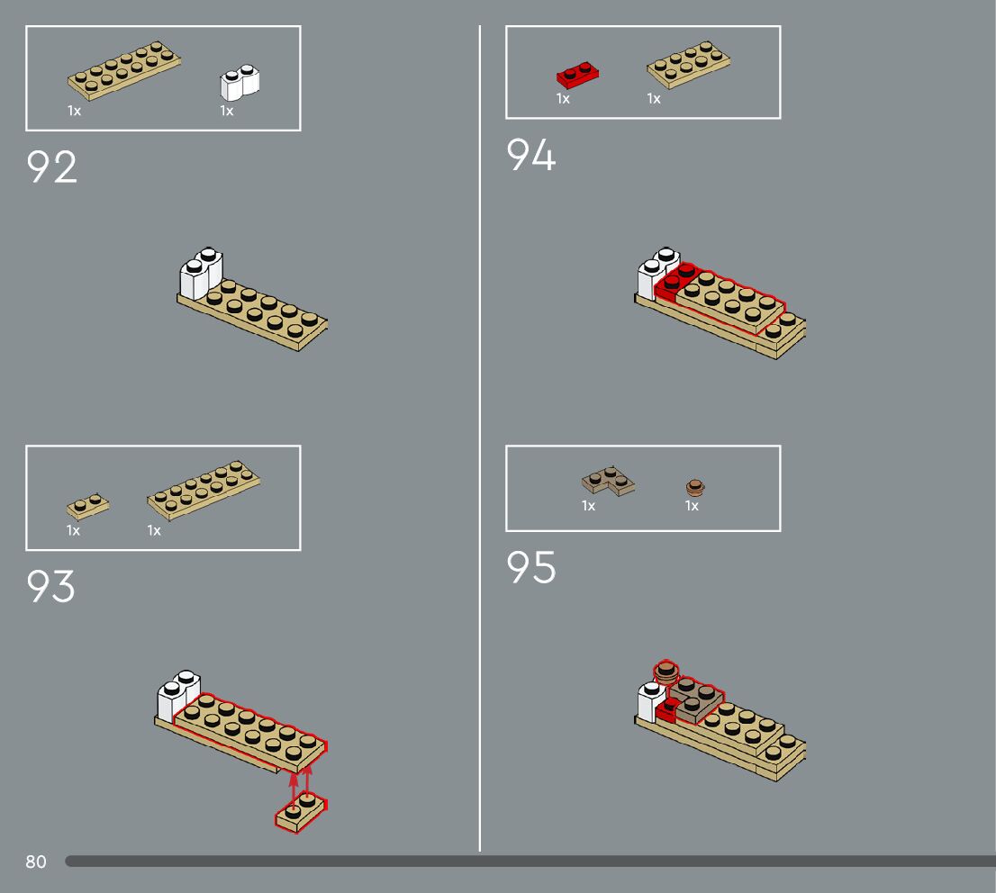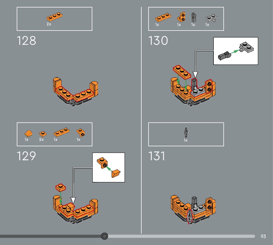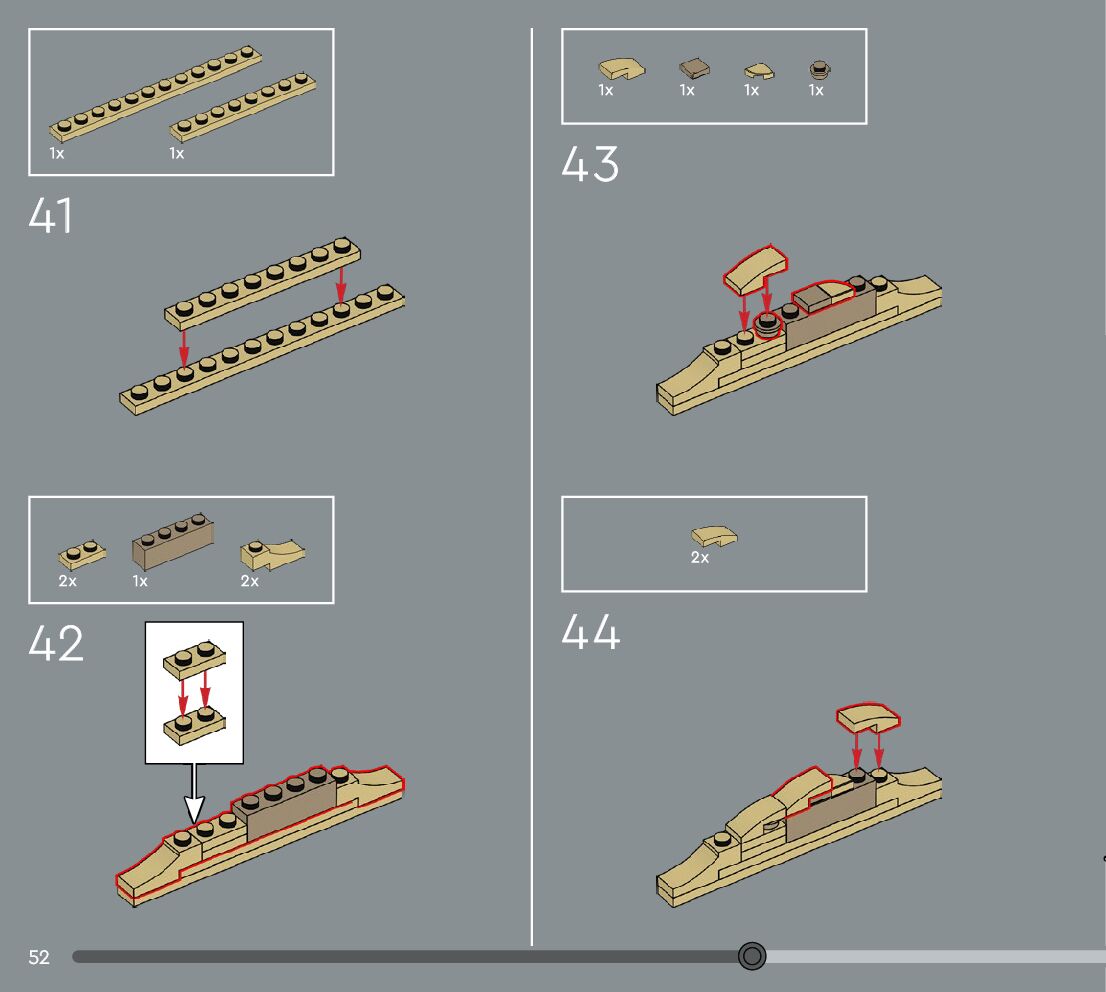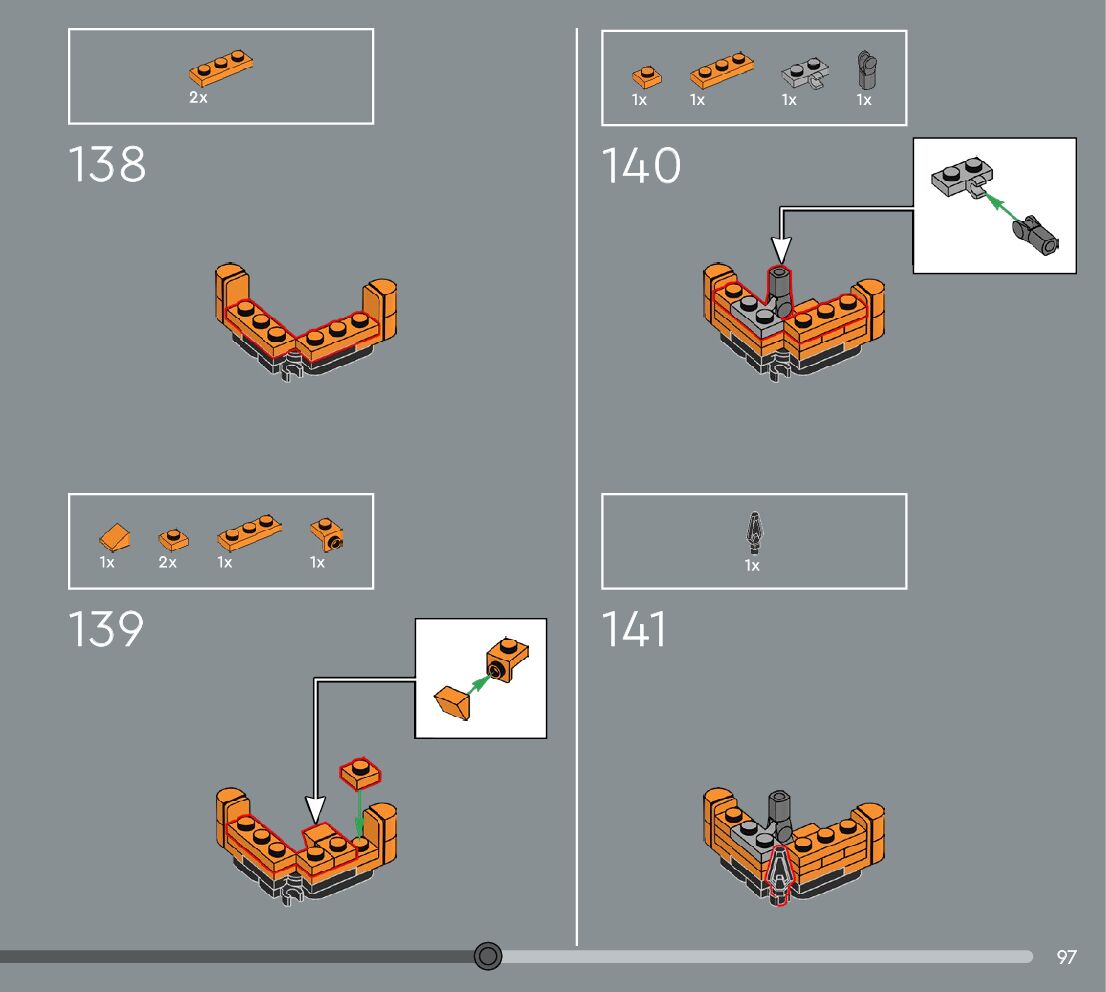 The assembly guide is prepared in a very understandable way for children and adult LEGO enthusiasts. A total of 136 picture galleries are shown, explaining the step-by-step construction stages for 1 different structures.