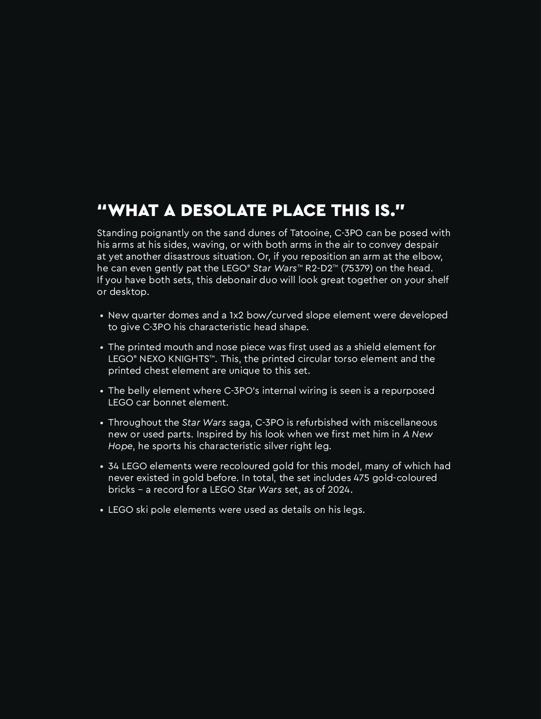 On this page you can find the original construction manual for the LEGO 75398 set. With the assembly manual you can easily learn how to build the 75398 C-3PO step by step. The set was released in 2024.