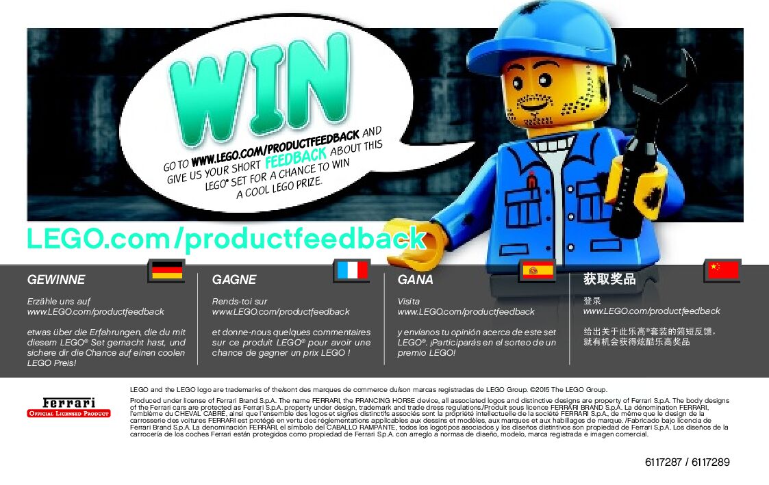 On this page you can find the original construction manual for the LEGO 75899 set. With the assembly manual you can easily learn how to build the 75899 LaFerrari step by step. The set was released in 2015.