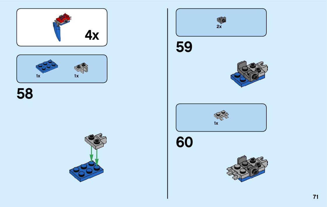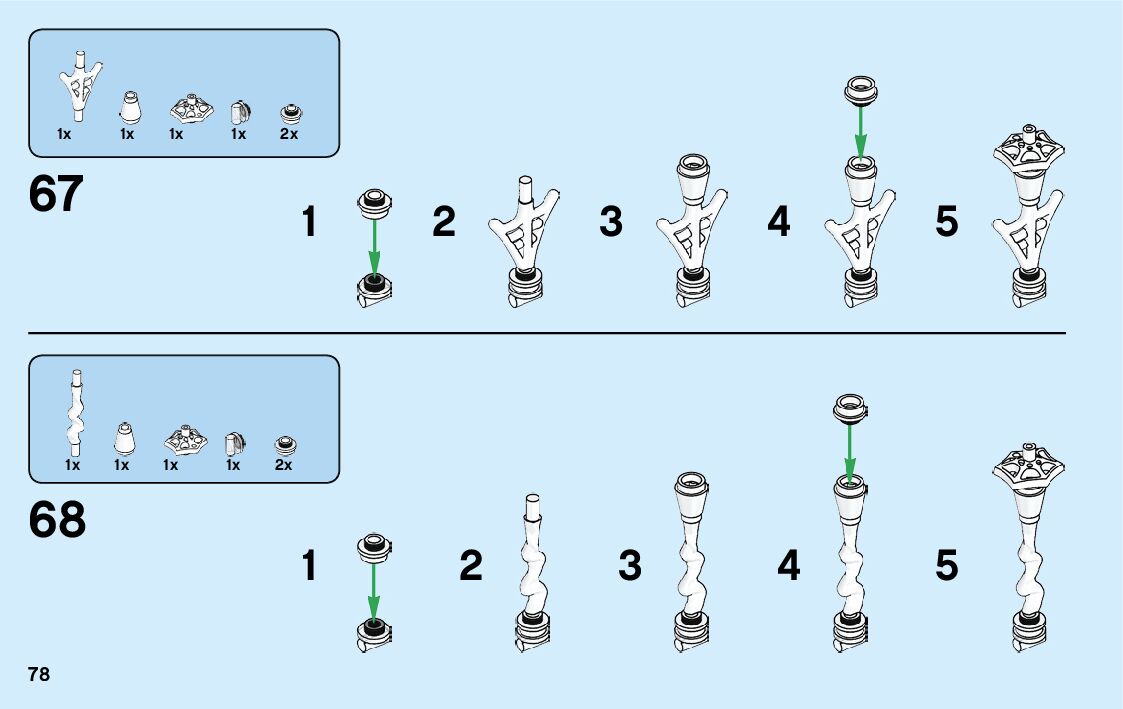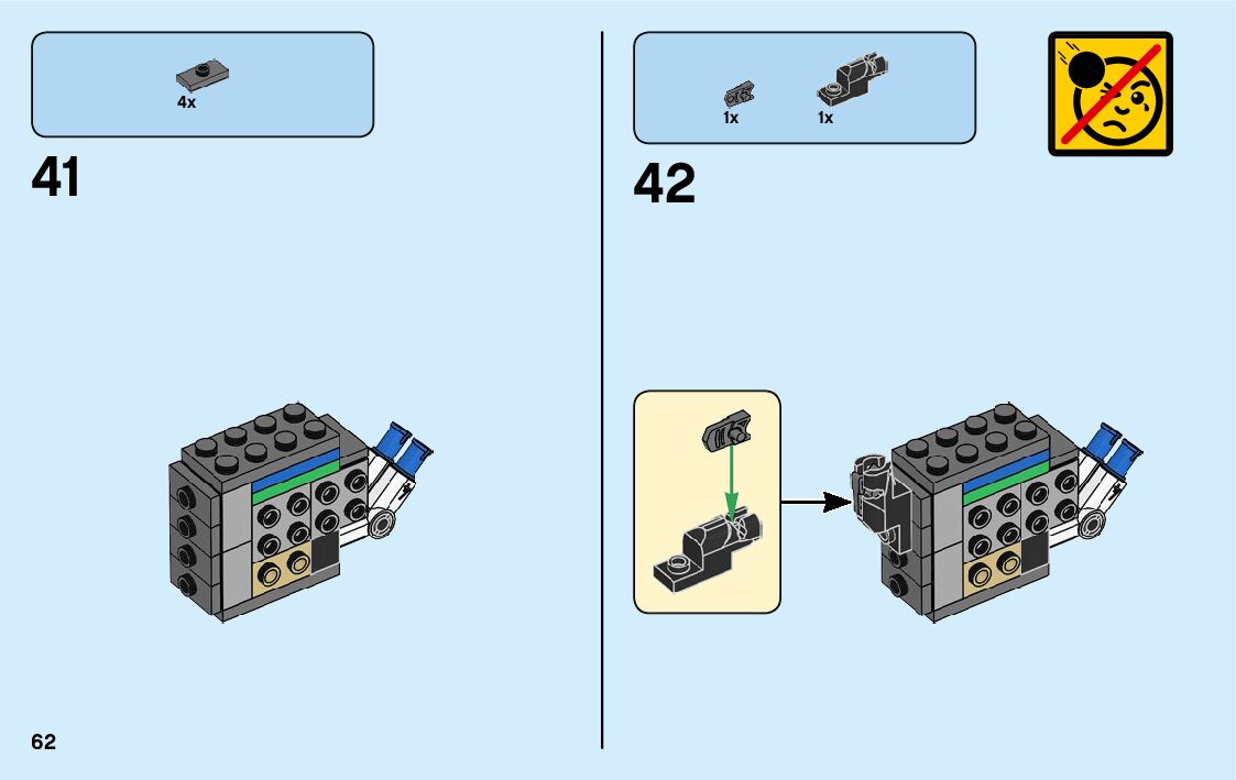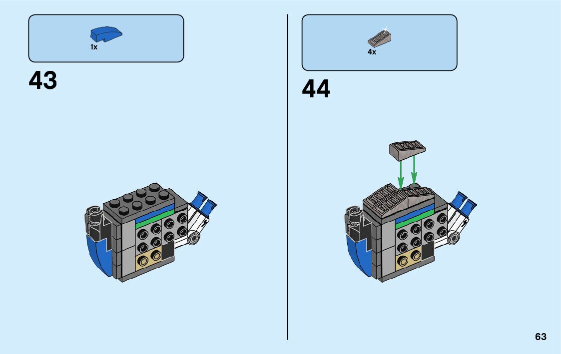 The assembly guide is prepared in a very understandable way for children and adult LEGO enthusiasts. A total of 84 picture galleries are shown, explaining the step-by-step construction stages for 1 different structures.
