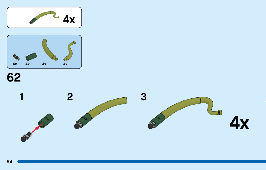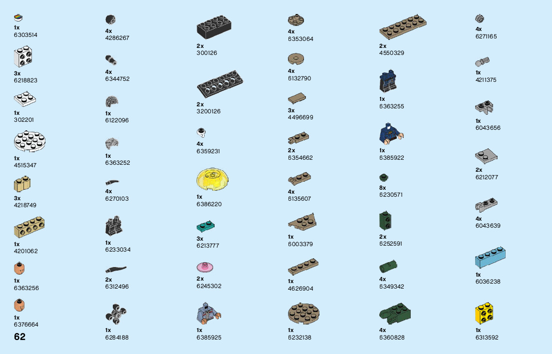 The assembly guide is prepared in a very understandable way for children and adult LEGO enthusiasts. A total of 64 picture galleries are shown, explaining the step-by-step construction stages for 1 different structures.