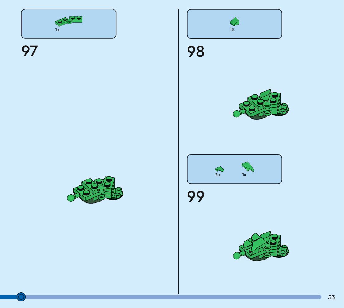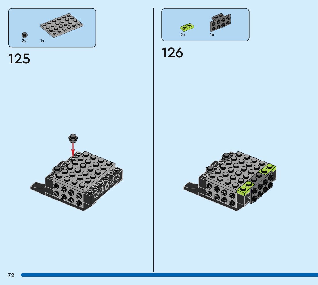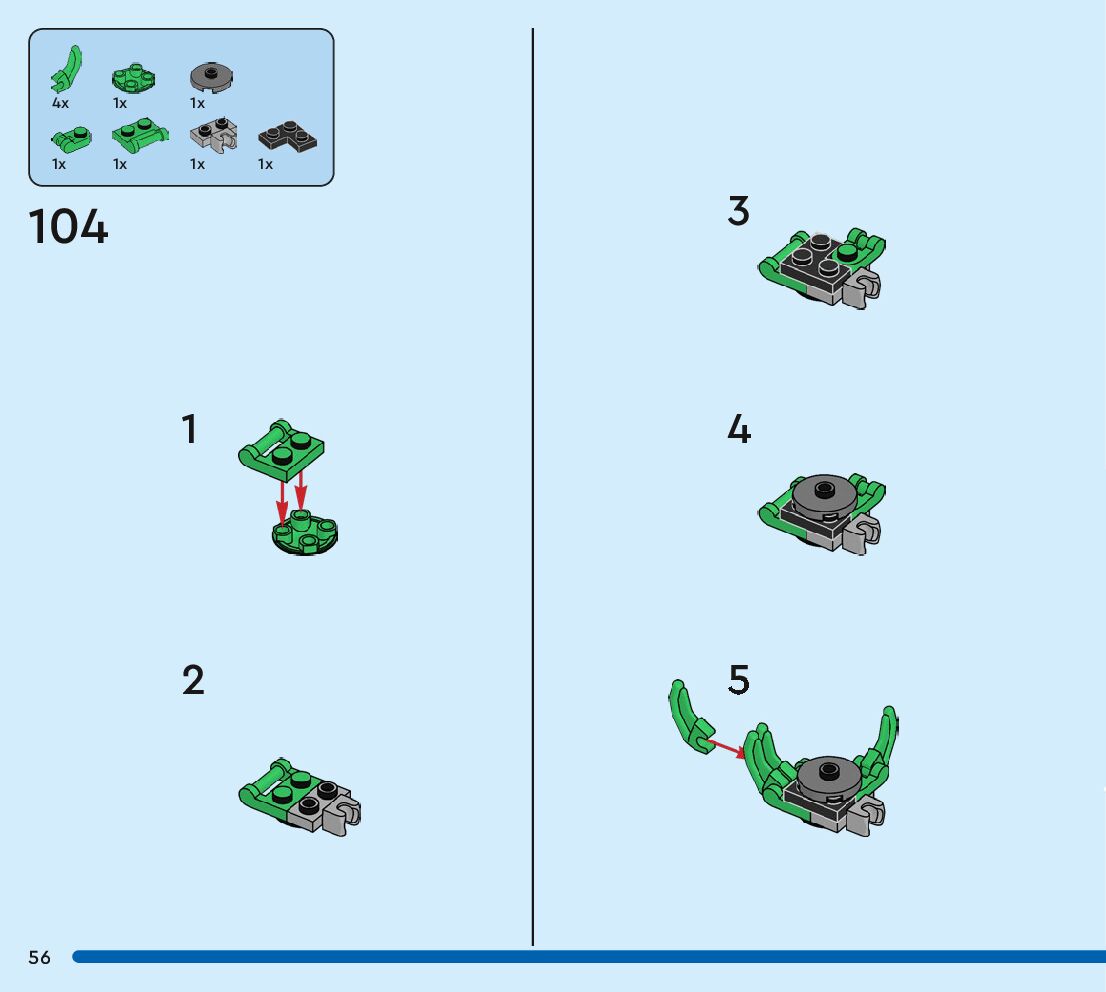 The assembly guide is prepared in a very understandable way for children and adult LEGO enthusiasts. A total of 104 picture galleries are shown, explaining the step-by-step construction stages for 1 different structures.