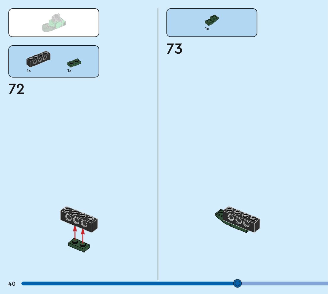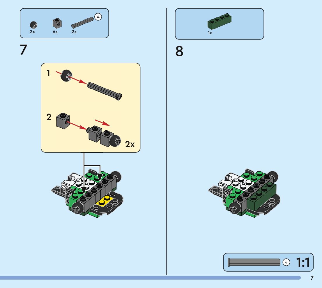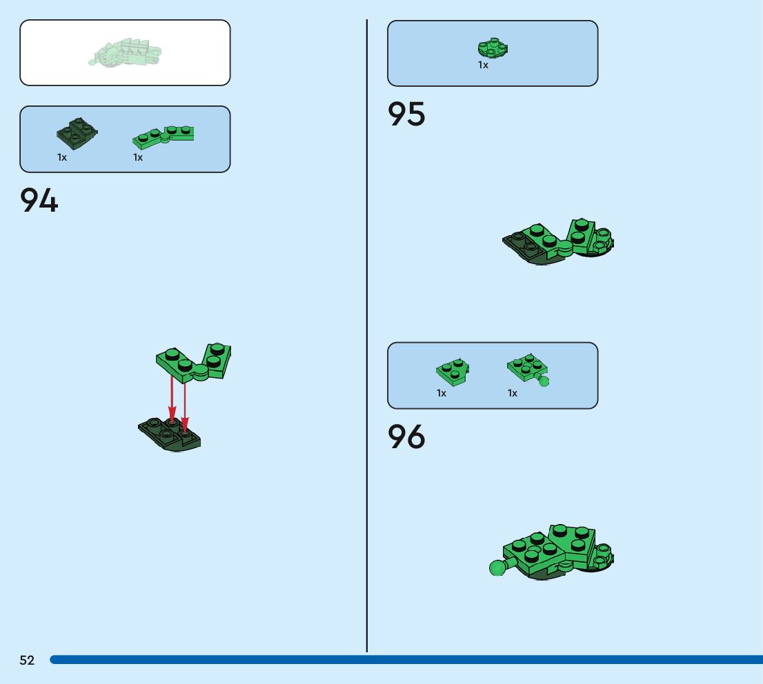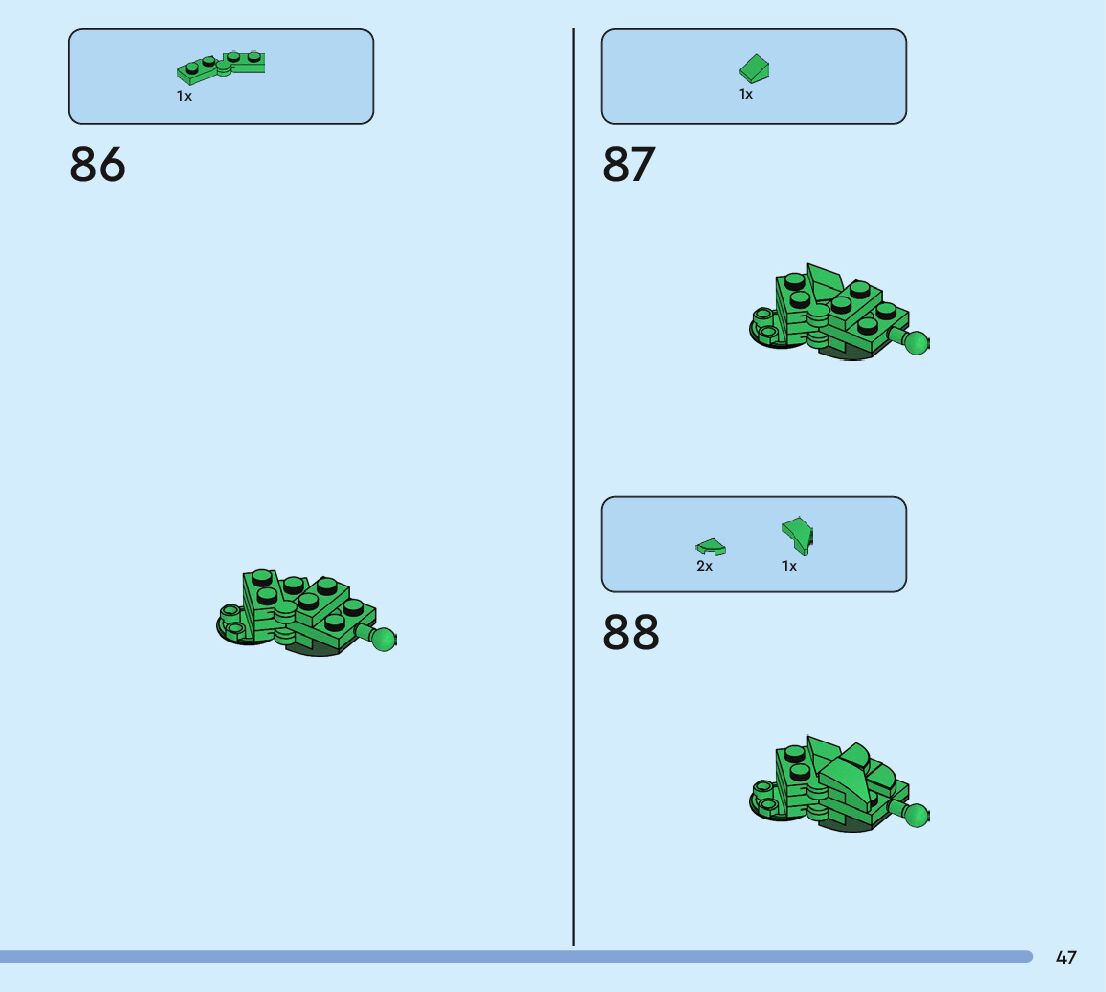 The assembly guide is prepared in a very understandable way for children and adult LEGO enthusiasts. A total of 104 picture galleries are shown, explaining the step-by-step construction stages for 1 different structures.
