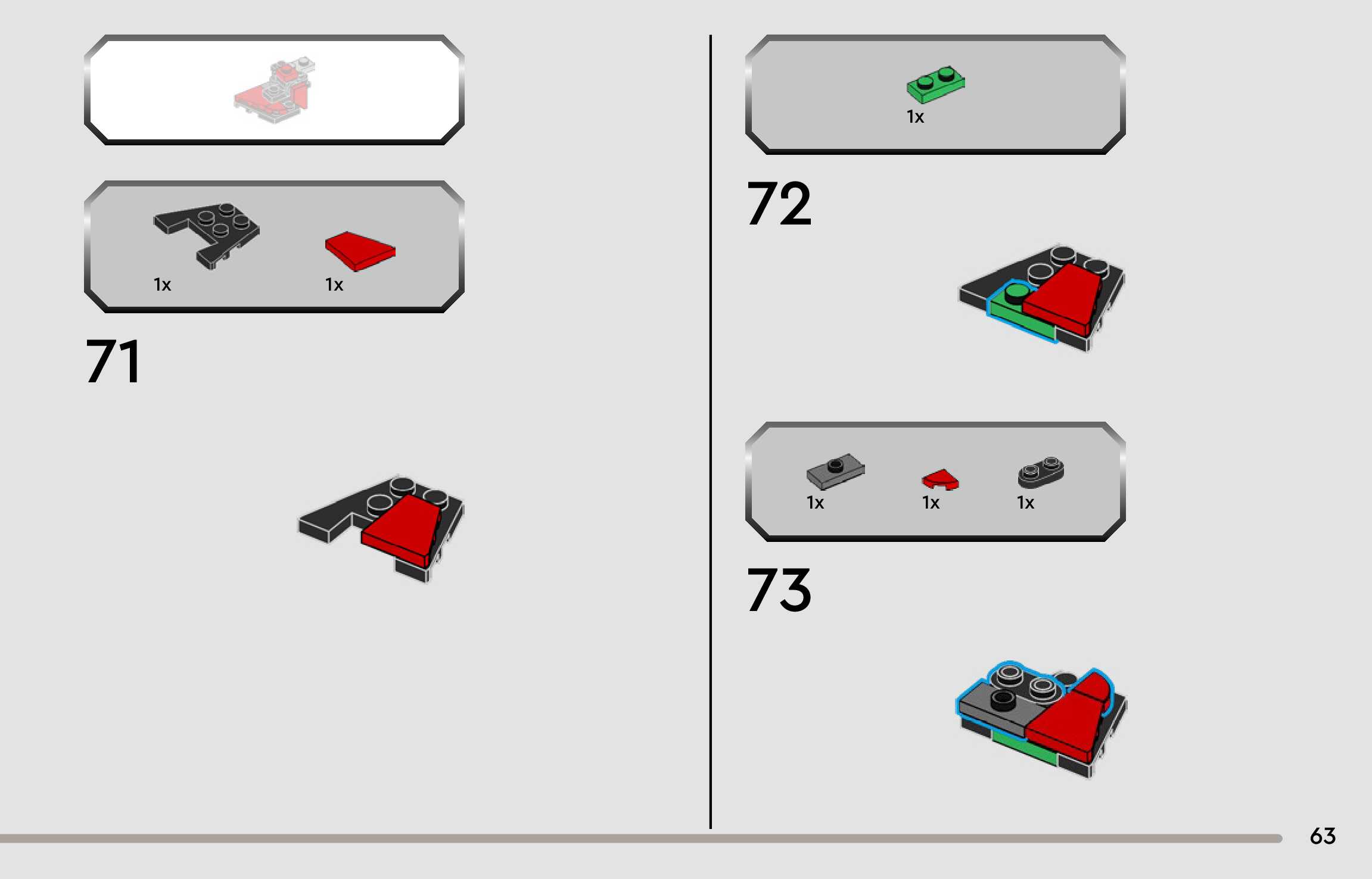 The assembly guide is prepared in a very understandable way for children and adult LEGO enthusiasts. A total of 124 picture galleries are shown, explaining the step-by-step construction stages for 1 different structures.