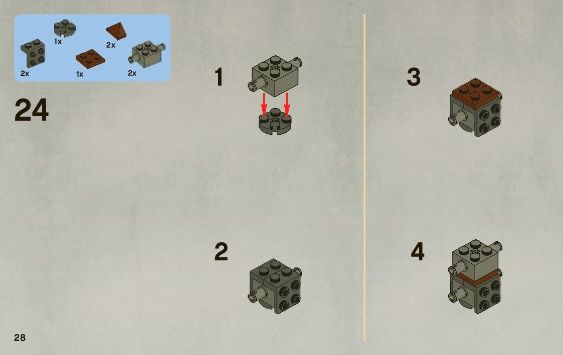 The assembly guide is prepared in a very understandable way for children and adult LEGO enthusiasts. A total of 56 picture galleries are shown, explaining the step-by-step construction stages for 1 different structures.