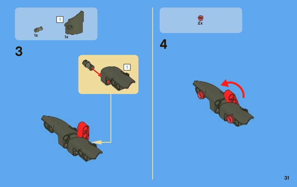 The assembly guide is prepared in a very understandable way for children and adult LEGO enthusiasts. A total of 88 picture galleries are shown, explaining the step-by-step construction stages for 2 different structures.