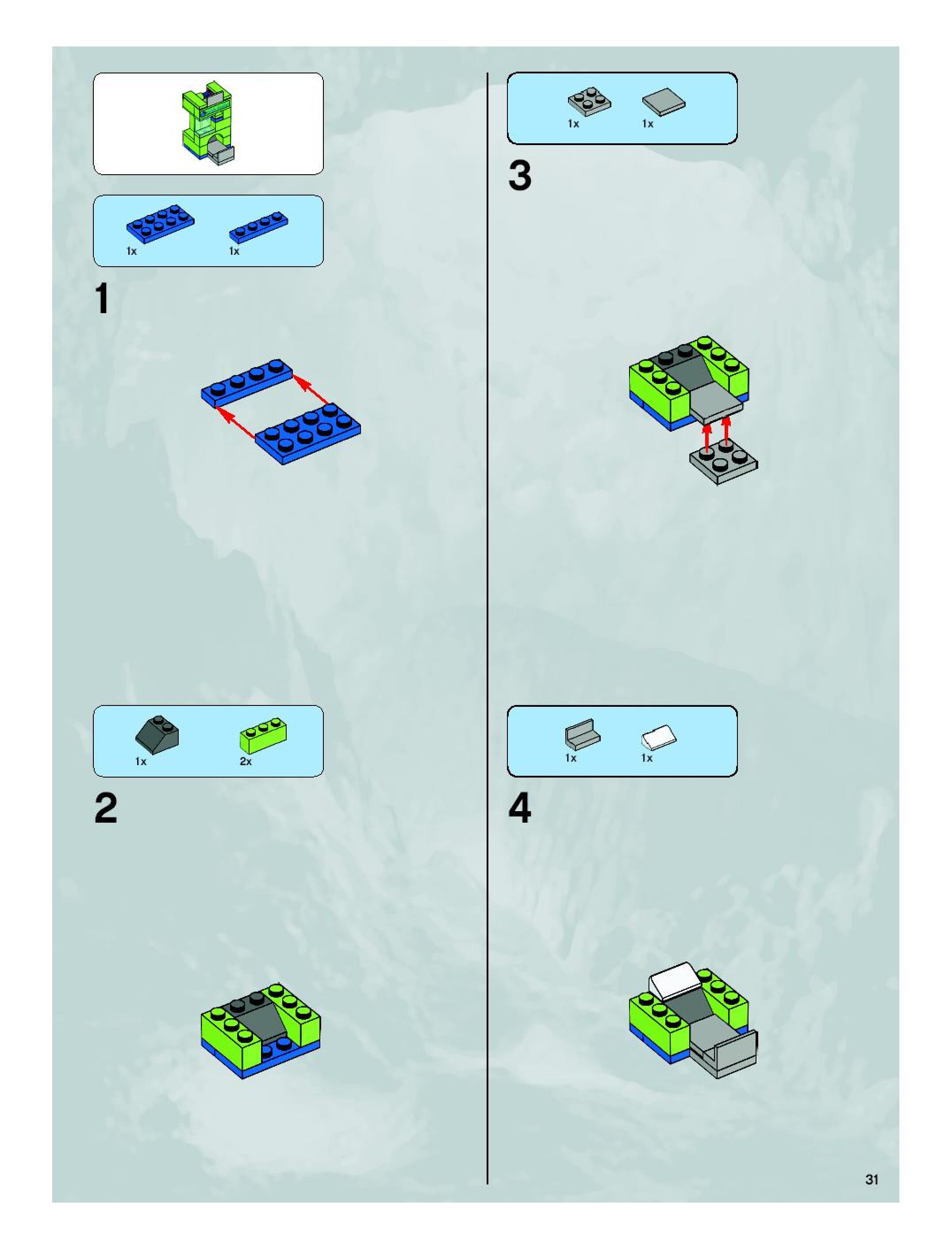 The assembly guide is prepared in a very understandable way for children and adult LEGO enthusiasts. A total of 576 picture galleries are shown, explaining the step-by-step construction stages for 2 different structures.